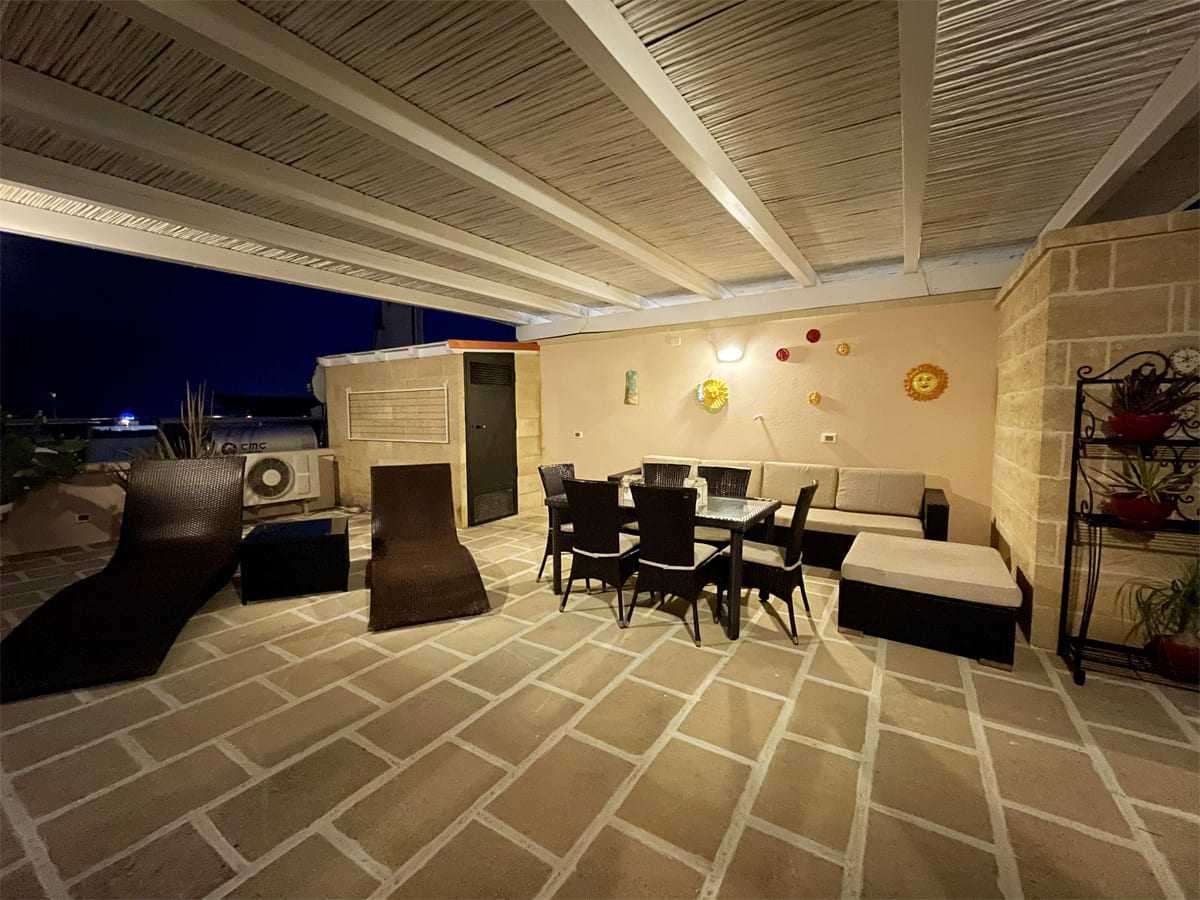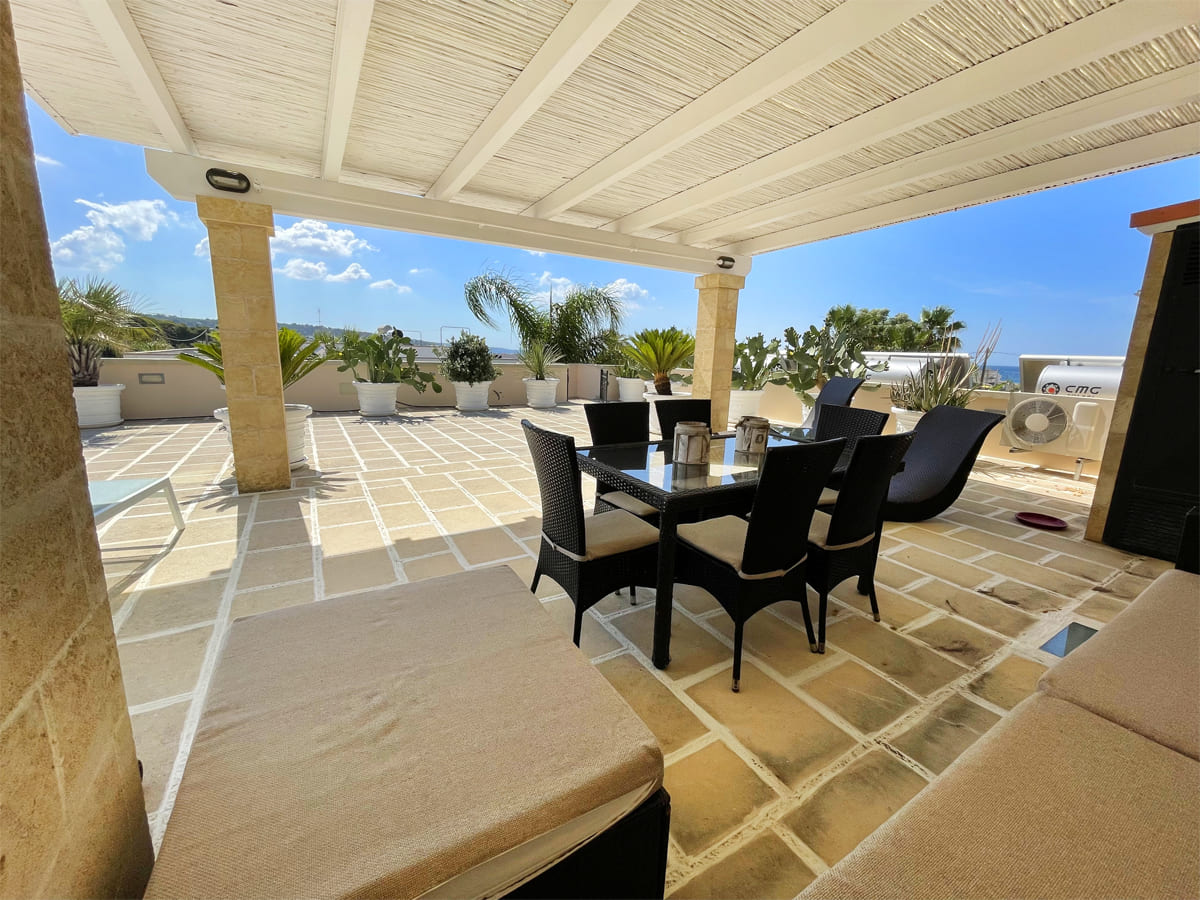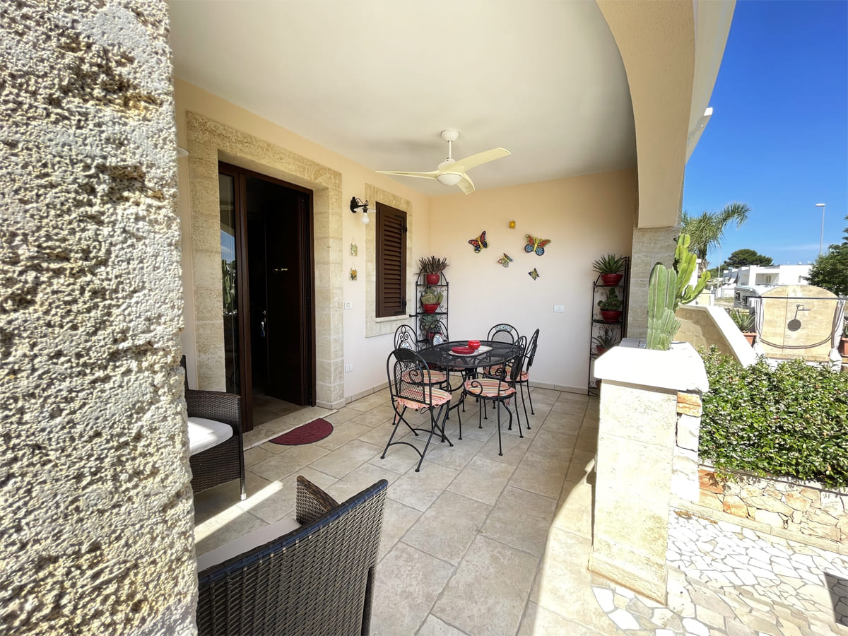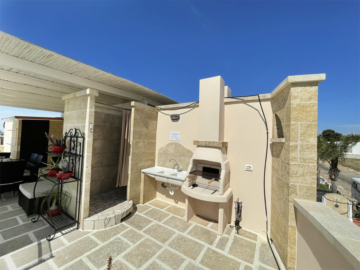 La casa vacanze è un trilocale a piano rialzato strutturato nel seguente modo: dal cancello d'ingresso si accede ad una veranda con doccia esterna (acqua calda/fredda) e mobili da giardino. Internamente la casa si compone di un ampio soggiorno con cucina a vista totalmente attrezzata e divano letto (2 posti letto), 2 camere da letto e un bagno. Infine, tramite una scala esterna, si accede alla vera attrazione della casa, ovvero una grandissima terrazza vista mare arredata con mobili da giardino, doccia esterna (acqua calda/fredda), barbeque e zona relax dove poter prendere il sole in tranquillità.